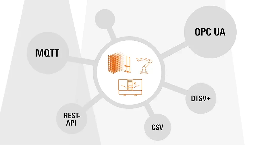 KASTOlink permet une mise en réseau sans faille des scies KASTO avec d'autres machines d'usinage, des solutions de stockage ainsi que des systèmes de gestion d'entrepôt et ERP. Il assure une chaîne de processus numérique continue, de la commande à la fabrication. La solution d'interface variée permet non seulement l'intégration dans les systèmes KASTO, mais aussi la connexion flexible à des machines d'autres fabricants. Ainsi, les utilisateurs mettent en réseau leurs produits KASTO de manière efficace et transparente avec l'ensemble de l'environnement informatique et des machines via des interfaces telles que OPC UA, MQTT ou REST-API, DSTV+, CSV ou couplage HOST propre à KASTO.