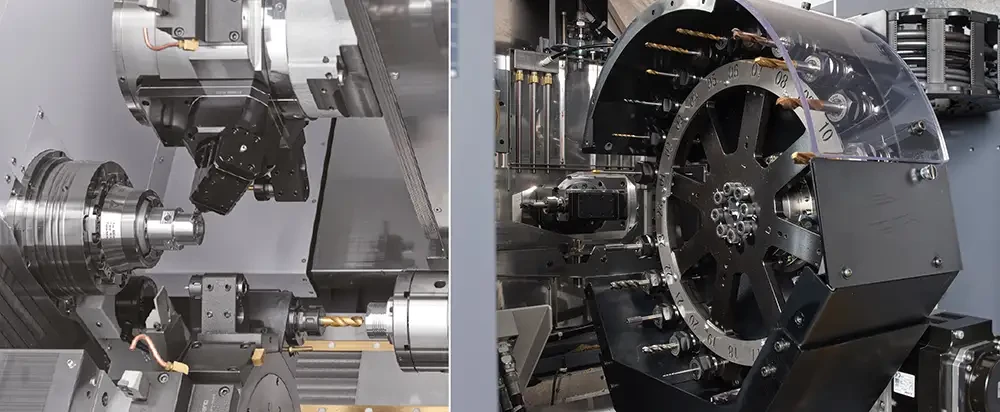 Ce nouveau tour est l'évolution logique (7ème génération) du modèle à succès, avec une structure renforcée et une zone d'usinage étendue. De conception originale, ce tour bi-broche bi-tourelle est économiquement très intéressant, son prix étant proche de celui d’un tour mono-tourelle.