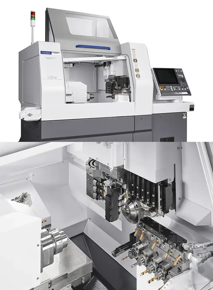 Le tour multifonction L32, modèle emblématique de la gamme Citizen-Cincom, est conçu pour l’usinage de pièces jusqu’à 38 mm de diamètre. Cette machine polyvalente convient aussi bien aux séries moyennes qu’aux grandes productions. Parmi ses atouts, citons ses capacités de répétabilité, la rapidité des déplacements d’outil à outil ainsi que sa robustesse. La L32 intègre la technologie brevetée LFV (Low Frequency Vibration).