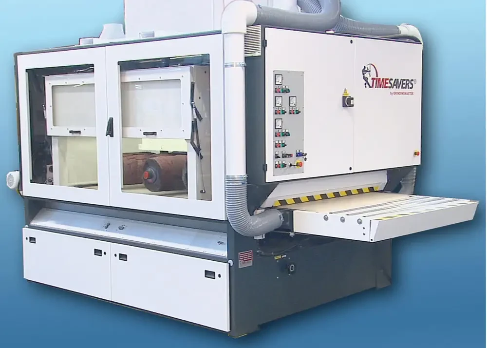 Cette nouvelle génération de machine TIMESAVERS 42-1350-WRbW est destinée à l\'ébavurage multidirectionnel et travaille à sec avec 2 bandes abrasives et 1 carrousel de 8 brosses à lamelles abrasives rotatives.