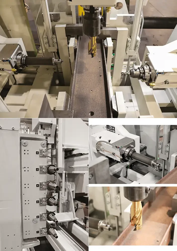- 3 unités d’usinage indépendantes, avec une course en x = 200 mm, permettant par exemple de percer les ailes des profilés H et en simultané de marquer la référence de la pièce dans l’âme.