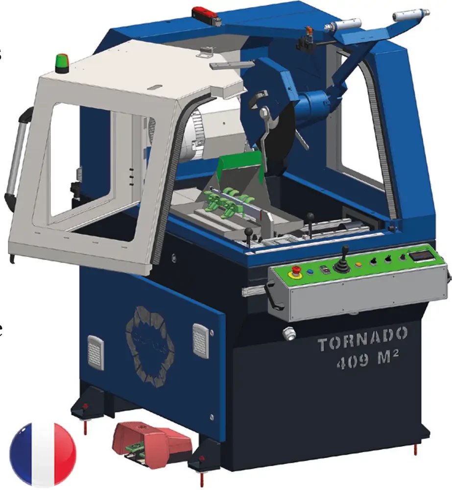 Cette machine est dédié au dégrappage rapide de petites pièces de fonderie fixées sur un barreau de distribution. Le tronçonnage est réalisé à vue par l’opérateur qui dispose de 2 axes pour placer sa meule avant la coupe : un mouvement AV/AR de la tête de tronçonnage de 200mm et un déplacement de l’étau de ±200mm vers la droite ou la gauche. Un double laser image sur la pièce la future trace de coupe à l’opérateur, il peut ainsi corriger sa position avant de couper. Les commandes sont doublées : joystick au pupitre ou boutons de commande au levier. Le tronçonnage se passe en sécurité à l’intérieur de la machine. Un étau à course courte et pression progressive permet de serrer les barreaux capot ouverts.