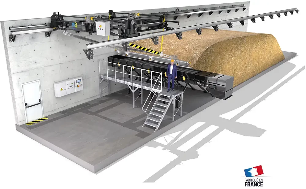 L’extraction du produit est réalisée à l’aide d’un chariot racleur se déplaçant sur des rails latéraux disposés le long du silo. Le bras du racleur, épouse la forme du tas et amène progressivement le combustible vers la zone avant (convoyeur d’évacuation) afin d’alimenter en continu la chaudière.